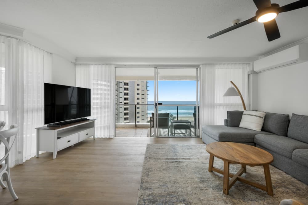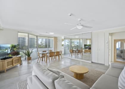 This premium Surfers Paradise apartment stands out for its unbeatable north-east corner position with panoramic ocean, river, and hinterland views, spacious two-bedroom layout with modern furnishings, and rare combination of boutique privacy in a low-density building paired with resort-style amenities including a pool, spa, sauna, BBQ area, and tennis court.